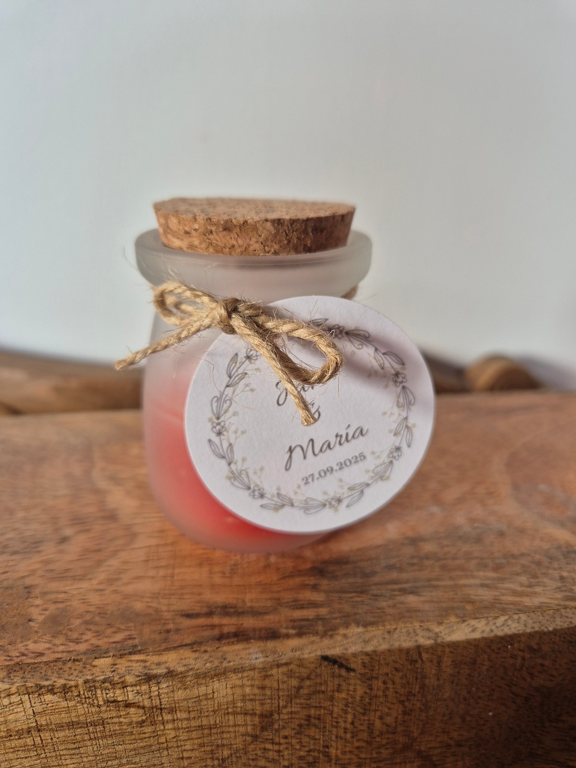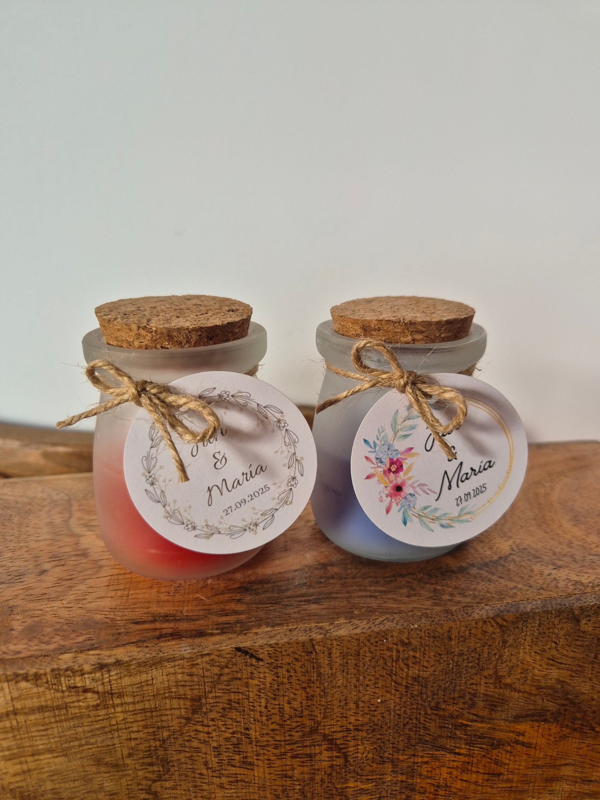 Nuestras velas de cristal personalizadas son un detalle elegante y actual, ideal para cualquier celebración. Se personalizan a tu gusto, con nombres, fechas o el mensaje que prefieras, creando un recuerdo especial que tus invitados disfrutarán y conservarán.